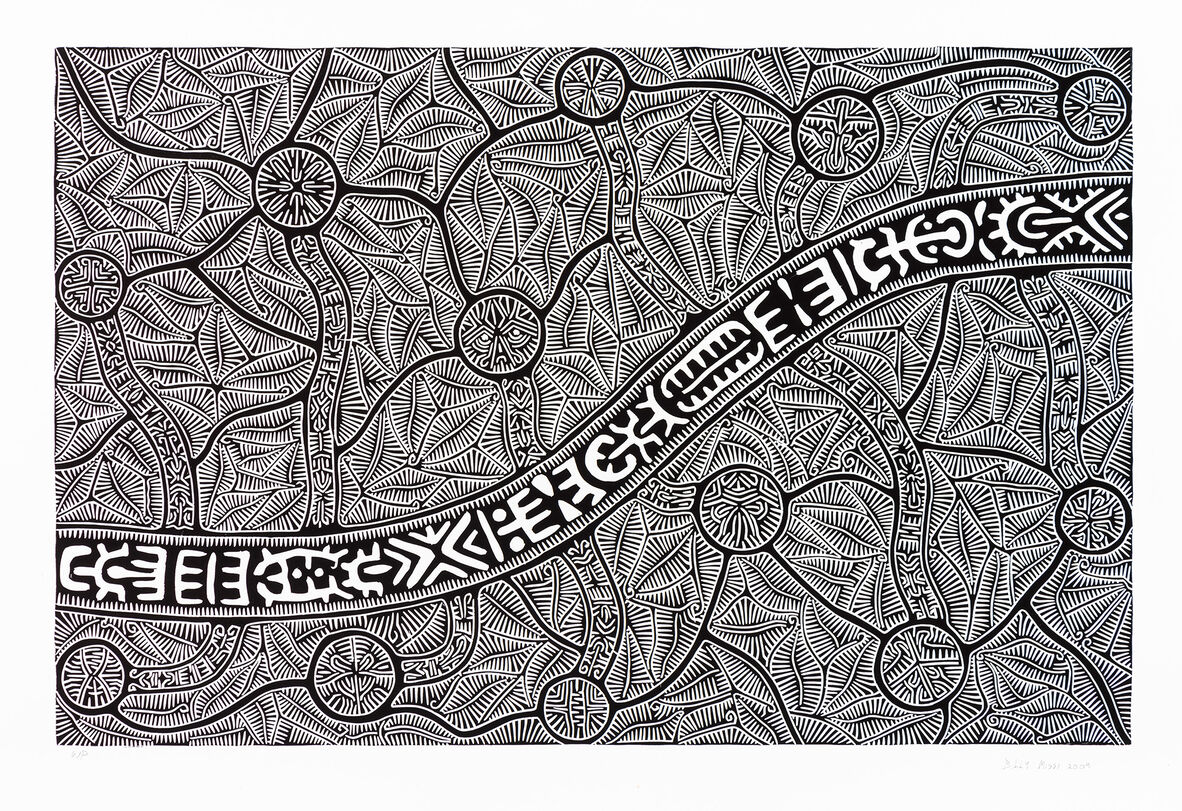 Born on Mabuiag Island, Missi’s art is deeply grounded in the storytelling, song, and dance traditions of his Wagadagam Tribe. Beginning in the 1990s, his practice fused traditional carving techniques with contemporary printmaking, creating bold, intricate linocuts that earned him international acclaim before his passing in 2012.