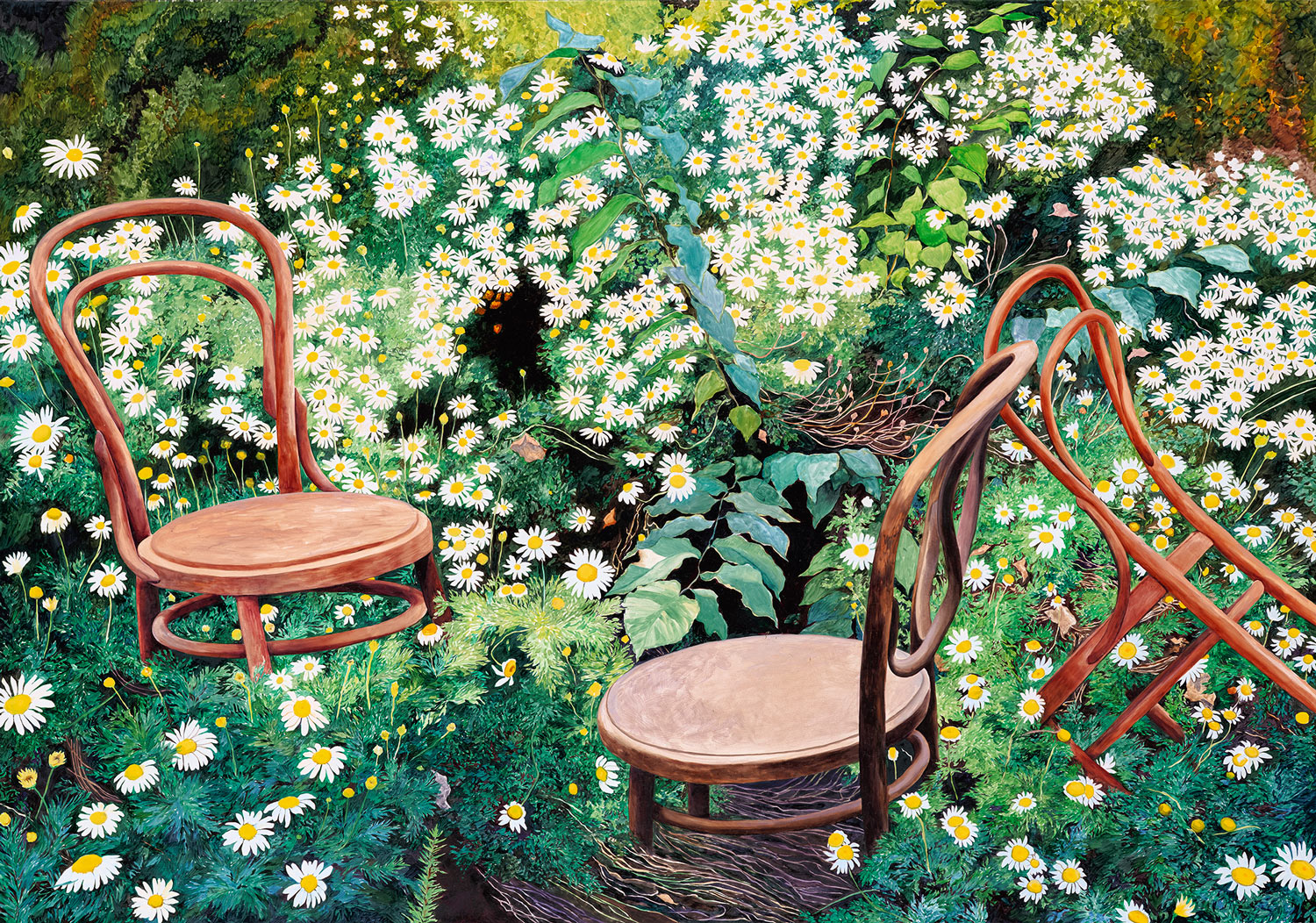 In Visitors, Monica Rohan presents a captivating new body of work in which chairs — long-time domestic companions — find themselves adrift in the landscape. Removed from their familiar interiors, they become uncanny stand-ins for the human form: both present and absent, invited and forgotten.