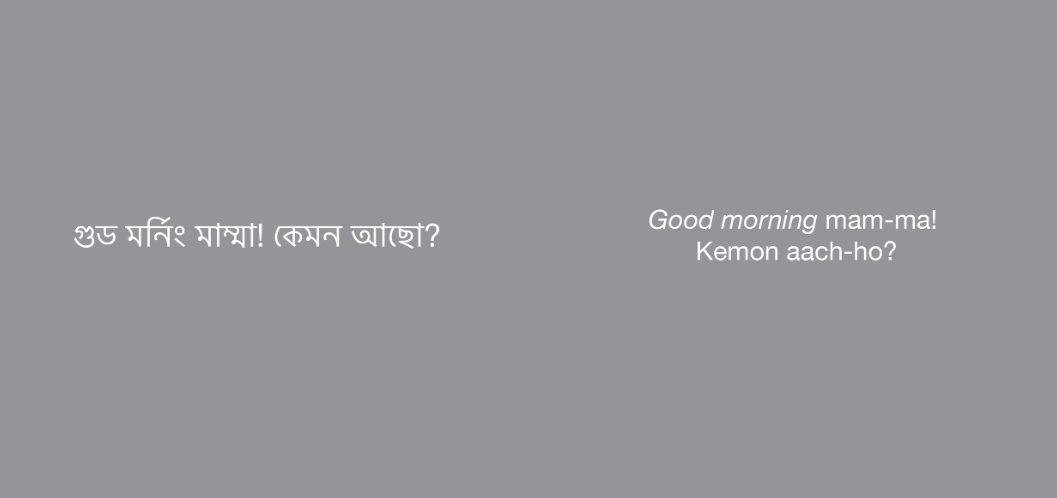 How to Speak my Mother’s Caring Words is a collection of text messages in Bengali from Paean’s mother, asking about her daughter’s day and health while she was away. The phrases are projected alongside their English phonetic spellings so they can be spoken aloud by both Bengali and non-Bengali speakers.