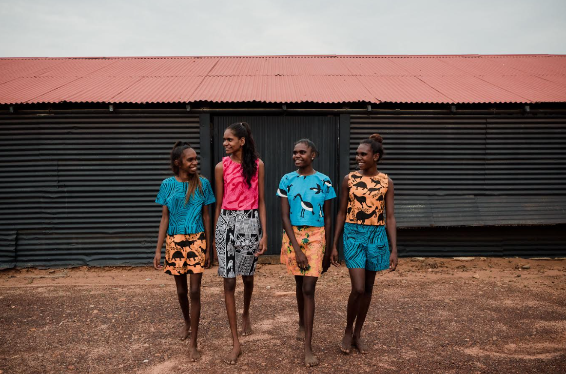 Image: Molly Rex, Jordan Unghango, Trinita Bundamurra and Zerika Clement wearing Leoni Melpi’s Waves, Graham Badari’s Nabarlek deja Ngarrbek (Rock Wallaby and Echidna), Reuben Manakgu’s Wakih (Fresh Water Prawns), Bede Tungatalum’s Tiwi Birds, Kodjdjan D Diaguma’s Murnubbarra Karrolka (Flying Magpie Geese), and Elizabeth Kandabuma’s Kun-ngol (Clouds) designs. Photo: Freedom Garvey-Warr and Kalumburu Photography Collective, Enterprise Partnerships.